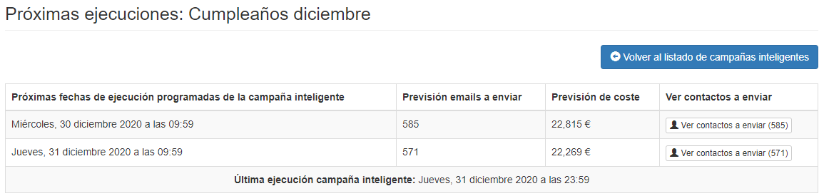 Esta herramienta nos permite comprobar la fecha de las próximas ejecuciones de la campaña inteligente, la previsión de Emails a enviar, el precio estimado para ese envío y los contactos a los que se enviará el Email.