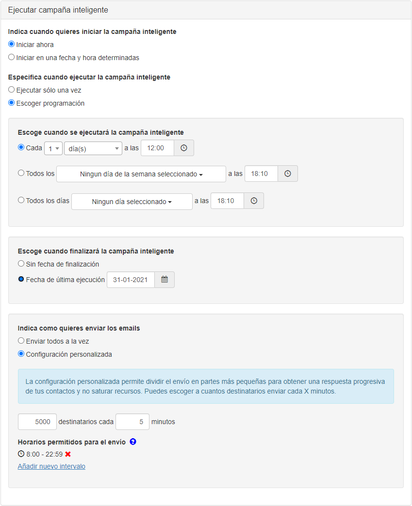 - Que la campaña inteligente se ejecute cada X días/meses/año en una hora determinada