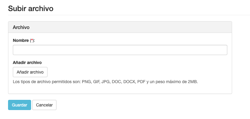 Escoge un nombre para el archivo y añade el archivo . Los tipos de archivo permitidos son: PNG, GIF, JPG, DOC, DOCX, PDF y un peso máximo de 2MB.